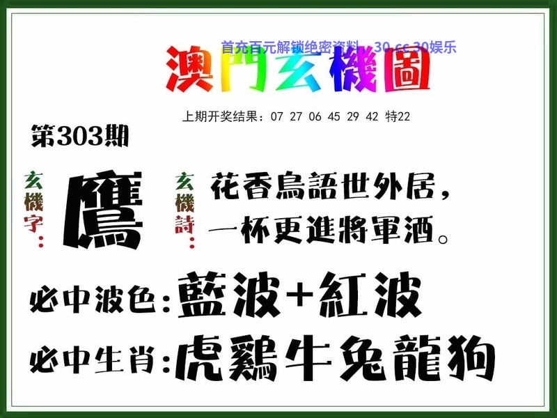 | 303期七肖 | 马鸡猴虎龙兔猪 | 开:兔15中 |